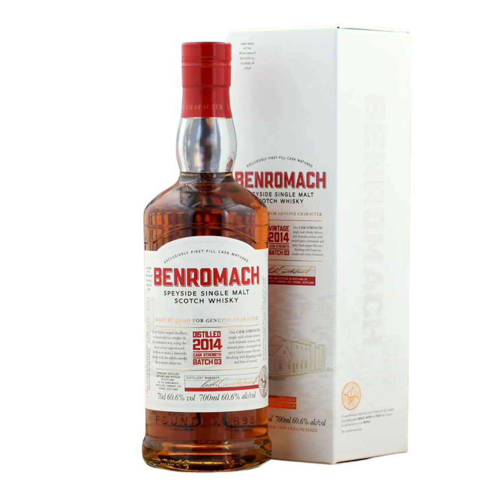 The latest batch of Benromach's cask strength has arrived, coming from a small parcel of just 48 casks, Bottled at a natural, undiluted strength, the stewed fruit, citrus and Christmas spice flavours are at their richest and fullest. The mildly peated barley brings a warmth of lingering smokiness, with creamy chocolate tones throughout.